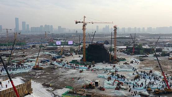 記者在哈爾濱冰雪大世界園區(qū)建設(shè)現(xiàn)場(chǎng)看到,工人們有序地忙碌著,塔吊、叉車、鏟車等各種機(jī)械設(shè)備在緊張作業(yè),工人切冰、鏟冰的聲音與作業(yè)機(jī)械的轟鳴聲,在園區(qū)內(nèi)交織成一首“建設(shè)交響樂”。