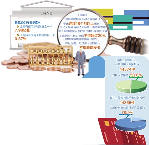 近年來,我國銀行業(yè)金融機(jī)構(gòu)信用卡業(yè)務(wù)快速發(fā)展,在便利群眾支付和日常消費(fèi)等方面發(fā)揮了重要作用。人民銀行發(fā)布的數(shù)據(jù)顯示,截至2021年三季度末,全國有信用卡和借貸合一卡7.98億張,人均持有信用卡和借貸合一卡0.57張。發(fā)卡量激增的同時(shí),行業(yè)亂象也被各界詬病,尤其是消費(fèi)者針對(duì)信用卡過度營銷、亂收費(fèi)等問題的投訴量近年來居高不下。