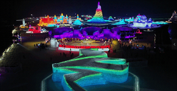 在30分鐘的暖場表演中,黑龍江哈爾濱、新疆阿勒泰、江蘇南京、廣東深圳等地舉行了慶祝活動,并以連線的方式與暖場演出進行互動。其中,哈爾濱的互動表演節(jié)目現(xiàn)場,選在了被譽為“黑龍江冰雪旅游名片”的哈爾濱冰雪大世界。