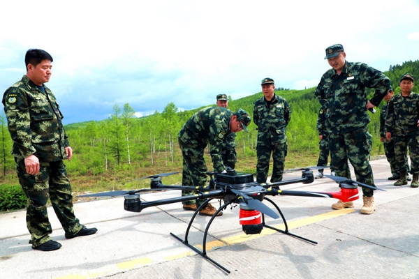 阿木爾林業(yè)局黨委副書記、局長、局防指總指揮韓鳳泉(左二)在查看無人機(jī)狀況(王力 攝)