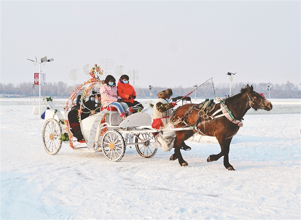 游客在松花江冰雪嘉年華景區(qū)體驗(yàn)雪地馬車(chē)。