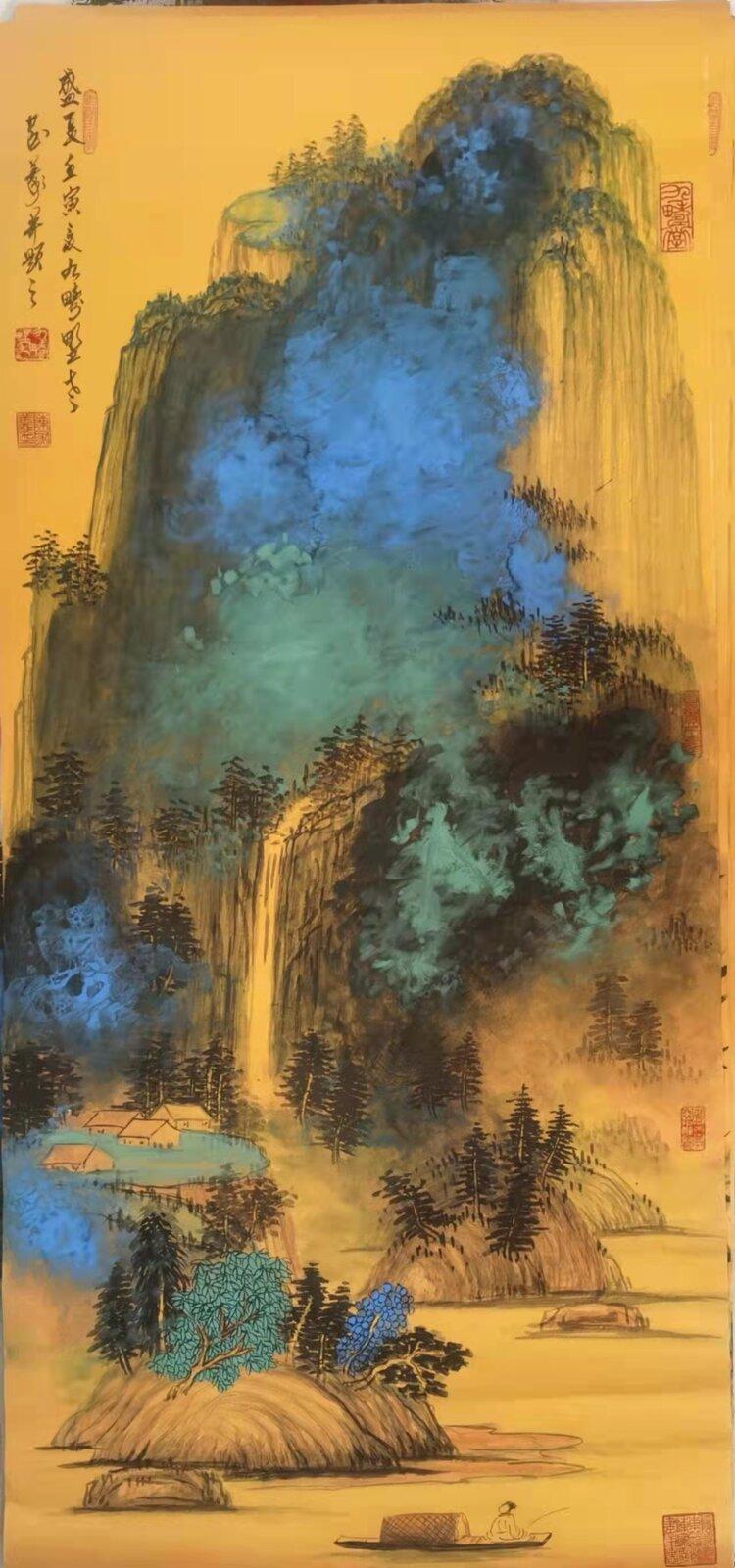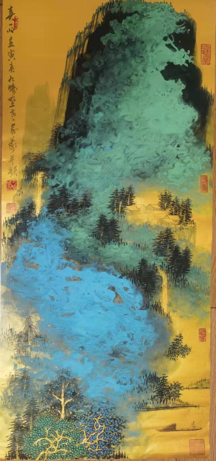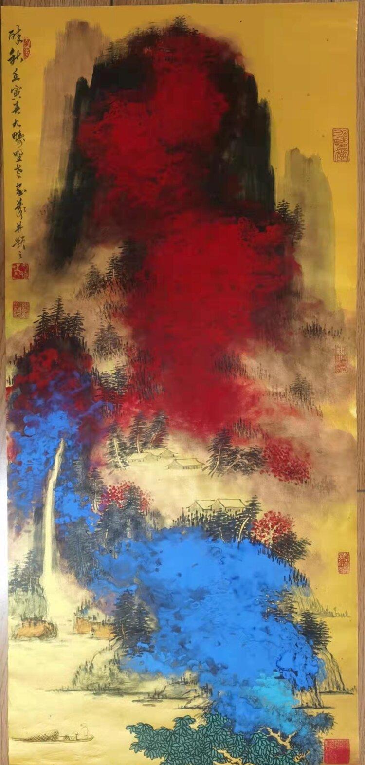 金箋畫是傳統(tǒng)繪畫的一種特有的形式,而彩墨作畫作為主要的方法和手段,其發(fā)展歷史久遠,金箋紙作畫給人以金碧輝煌、瑰麗富貴的形象,為人們所喜聞樂見。畫家在金箋紙上畫潑彩山水,更使之呈現(xiàn)出異樣的光彩。