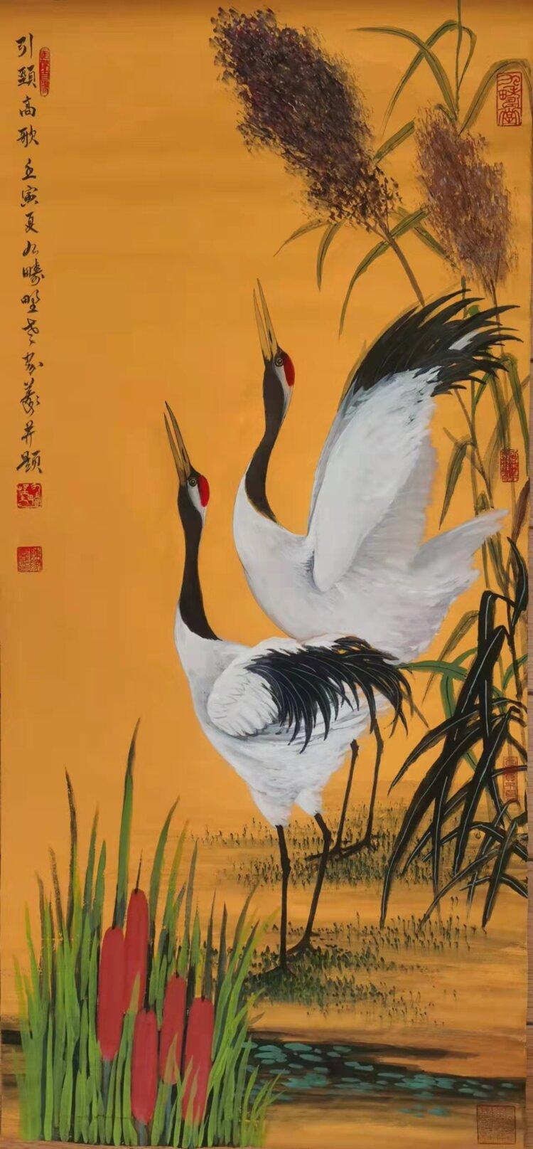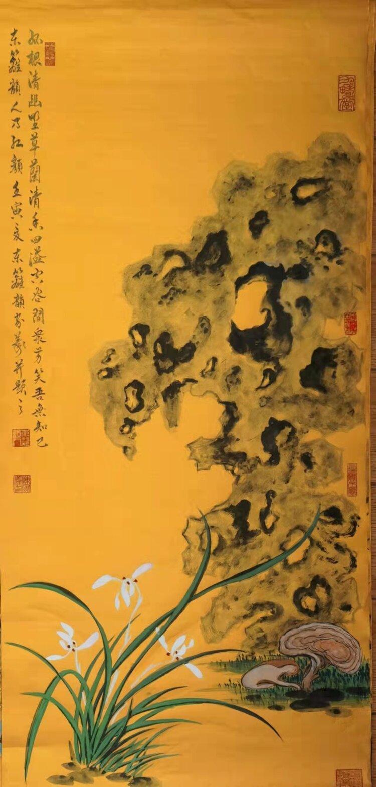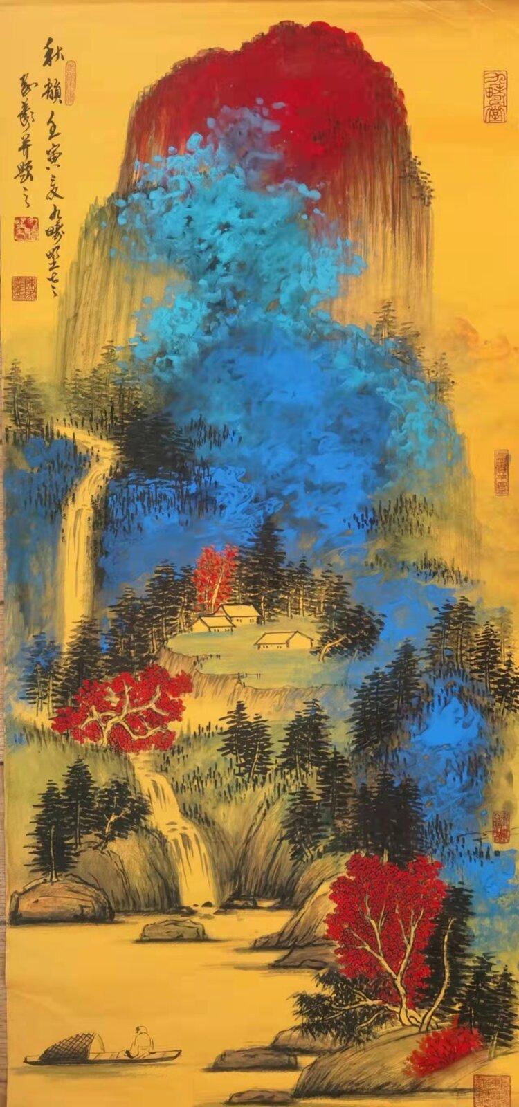 金箋畫是傳統(tǒng)繪畫的一種特有的形式,而彩墨作畫作為主要的方法和手段,其發(fā)展歷史久遠,金箋紙作畫給人以金碧輝煌、瑰麗富貴的形象,為人們所喜聞樂見。畫家在金箋紙上畫潑彩山水,更使之呈現(xiàn)出異樣的光彩。