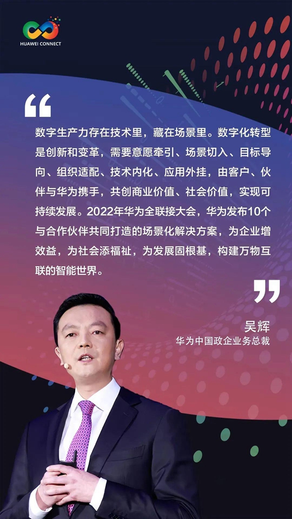 當(dāng)前,我國的數(shù)字化已經(jīng)進(jìn)入快車道,釋放數(shù)字生產(chǎn)力正當(dāng)其時(shí)。而“數(shù)字生產(chǎn)力就存在技術(shù)里,藏在場景里?!被诖?,華為中國政企業(yè)務(wù)總裁吳輝在會上發(fā)表了題為《為行業(yè)找技術(shù),深入場景創(chuàng)造價(jià)值》的主題演講,重點(diǎn)分享了華為基于多年的探索和實(shí)踐總結(jié)出的行業(yè)數(shù)字化轉(zhuǎn)型的方法論和企業(yè)轉(zhuǎn)型成功秘訣。