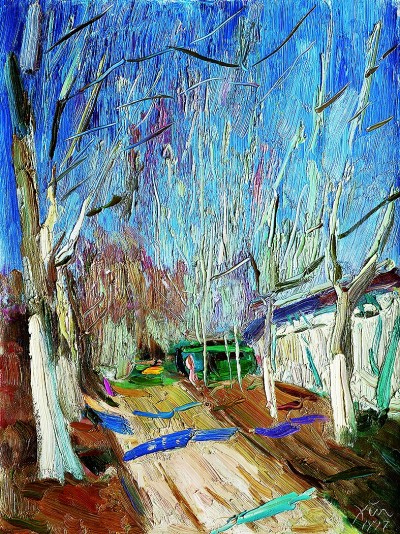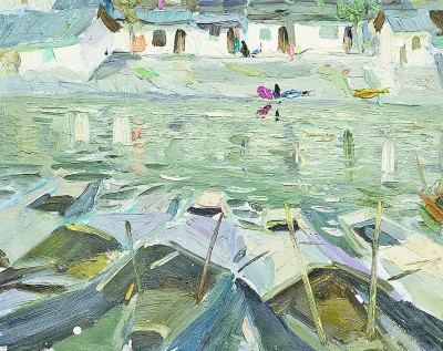 在諶北新的代表性作品里,無論何種結(jié)構(gòu),色調(diào)、筆觸、造型、線條都可以獨立觀賞。一塊厚堆的白色顏料,可以是云朵、是白墻,或是前后重疊的船帆。用筆的疏密、狀貌和節(jié)奏都有獨立存在的意義,既可以像欣賞書法用筆一樣拋開物象去體味,又可以去想象和填補與之恰合的物象和自然關(guān)系。諶北新對書法的深入研究和長期的繪畫寫生,以及他對物象、空間、色彩關(guān)系的觀察與創(chuàng)造實踐,使其作品能夠?qū)⒉煌谋憩F(xiàn)手法有機地融為一體。比如一筆畫下去,既表現(xiàn)空間層次,也體現(xiàn)厚薄輕重,同時展現(xiàn)光線的微妙變化。這種綜合性的呈現(xiàn)效果,實際上也契合著中國山水畫所追求的通過用筆的輕重緩急,通過虛實濃淡的墨色渲染,通過遠近高低的畫面布局,表現(xiàn)山水對人的情感與心靈的影響。而諶北新的風景油畫,正是基于中國人對山川草木的喜愛之情,通過體察和探求提煉出的獨特意象,它符合現(xiàn)代人的心理需求,也呼應(yīng)著畫家畢生追求的藝術(shù)境界——須其自來,不以力構(gòu)。