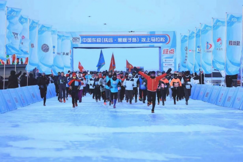 中國東極(撫遠·黑瞎子島)冰上馬拉松賽已經連續(xù)五屆在撫遠市舉辦,憑借地域唯一性和極限挑戰(zhàn)性,成為全球五大冰上馬拉松之一,開創(chuàng)中國極限冰雪馬拉松運動的先河。本屆賽事由黑龍江省體育局、佳木斯市人民政府主辦,省政府黑瞎子島建設和管理委員會、撫遠市人民政府承辦。中國奧委會副主席、中田協(xié)名譽主席段世杰前往比賽開幕式鳴槍。賽事設有全程馬拉松、半程馬拉松、新年歡樂跑三個項目。清晨7點,撫遠市的氣溫達到了零下23.3攝氏度,選手們紛紛帶上防風面罩、保暖帽、手套、太陽鏡、防滑冰爪等應對極端嚴寒環(huán)境下的特殊裝備,在全程42.195公里的冰賽道上,徒步穿越冰雪世界,體驗當?shù)鬲毺乇┪幕兔袼罪L情,品嘗賽道補給站提供的熱氣騰騰的鱘鰉魚鍋、鮮鯽魚湯等地方特色補給品,補充能量抵御嚴寒。