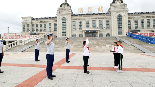 在國旗下,漠河市邊境檢查站代表陳澤和“全區(qū)十佳駐村干部”王成龍用自己生動的故事為在場的每位少先隊員們上了一堂生動的國防教育課,漠河市的少先隊員代表王涵在國旗下表達了對祖國的熱愛和對戍邊工作者們的敬佩。團省委副書記陳海萍在講話中鼓勵少先隊員要學習漠河戍邊工作者們的堅韌不拔和無私奉獻,要立足祖國最北方志存高遠、勤奮學習、錘煉品德、強健體魄,敢于創(chuàng)新、富于創(chuàng)意、樂于創(chuàng)造,要沿著“入隊、入團、入黨”的“人生三部曲”奮力前進,為推進中國式現(xiàn)代化、實現(xiàn)強國復興偉業(yè)貢獻青春力量。