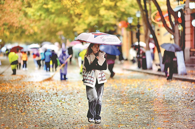 雨中秋意濃。10日一場(chǎng)秋雨,哈爾濱街道兩側(cè)的樹(shù)葉紛紛飄落,滿地落葉如同一層金色地毯,為秋日冰城增添了更多魅力。外出的人們撐起五顏六色的雨傘,走在落葉間,構(gòu)成了一幅幅美麗的油畫(huà)。