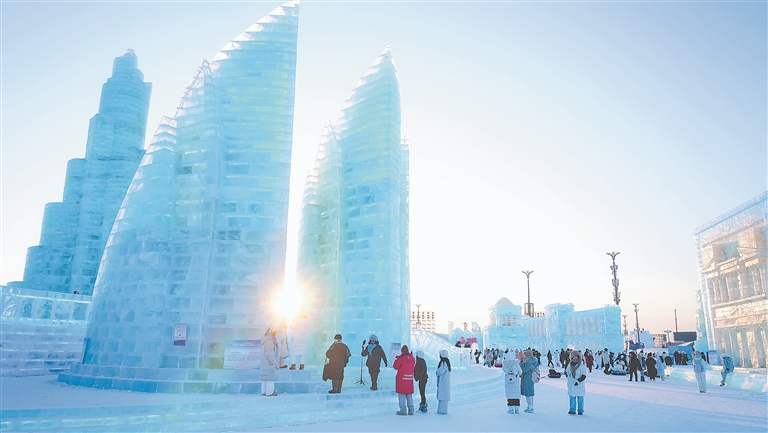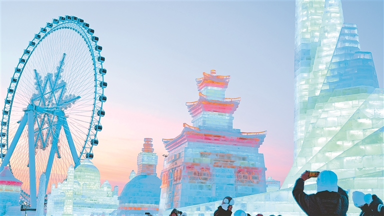 哈爾濱冰雪大世界將亞奧理事會成員的地標(biāo)景觀以冰雪形式呈現(xiàn),獨具匠心的冰雕建筑讓游客足不出園游亞洲。本報記者 劉心楊攝