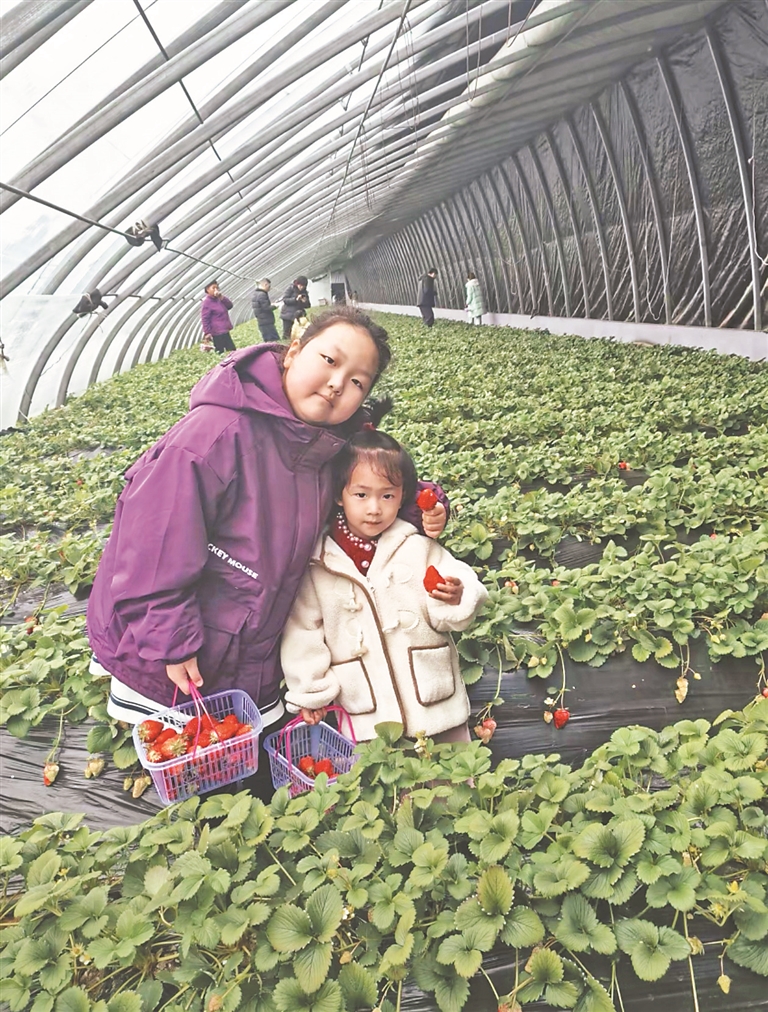 據(jù)園區(qū)負責人張立元介紹,2月份以來,日均接待游客超過100人次,周末時人數(shù)成倍增長。大棚內,草莓占地5畝,通過自主育苗、全程采用無公害種植技術等方式,產量和質量實現(xiàn)雙提升,年產量約6000斤。