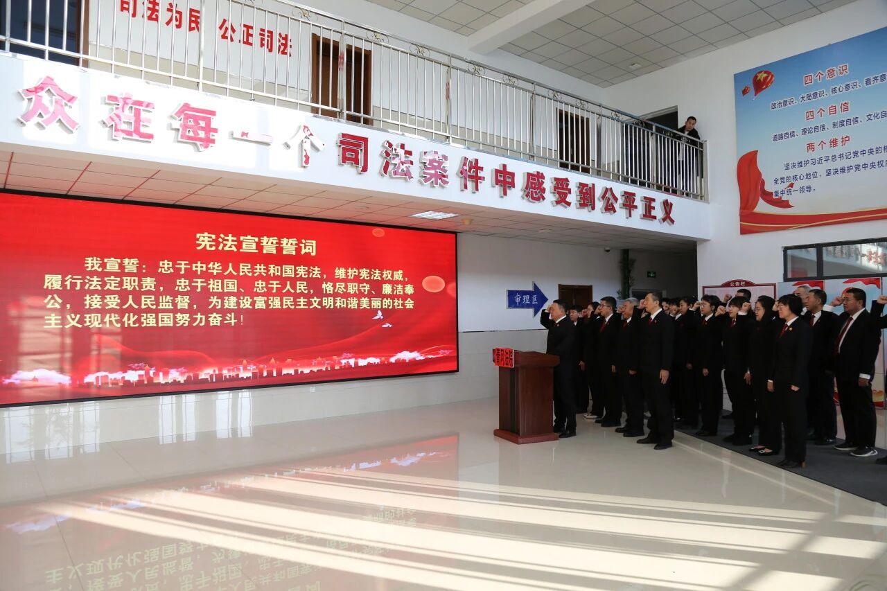 孫長久院長左手撫按憲法,舉起右拳,高聲領誓,各位干警莊嚴宣誓——“我宣誓:忠于中華人民共和國憲法,維護憲法權威,履行法定職責,忠于祖國、忠于人民,恪盡職守、廉潔奉公,接受人民監(jiān)督,為建設富強民主文明和諧美麗的社會主義現(xiàn)代化強國努力奮斗!”
